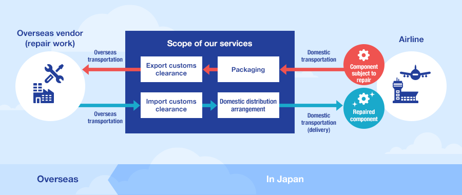 Japanese airlines procure many of parts they use from overseas vendors, and parts that arrive in Japan from overseas undergo the import customs clearance procedure in a bonded area and are sent to the maintenance site of airlines or their partner companies.